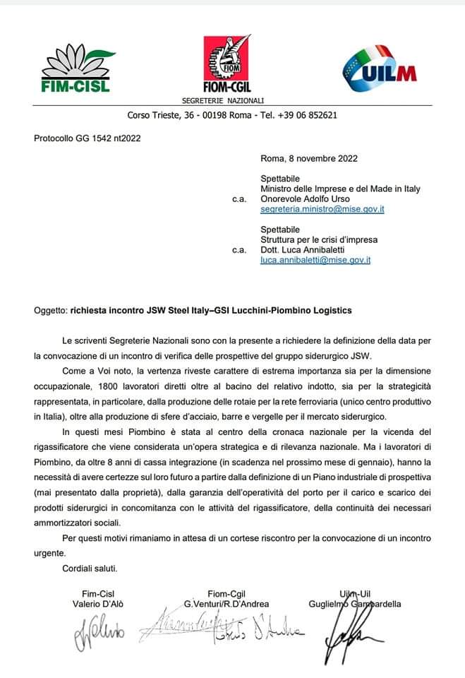 Dopo l’incontro con i Parlamentari a livello territoriale, le Segreterie Nazionali Fim Fiom Uilm hanno chiesto un incontro urgente al nuovo Ministro On. Adolfo Urso per Jsw Steel – Gsi- Piombino Logistics.