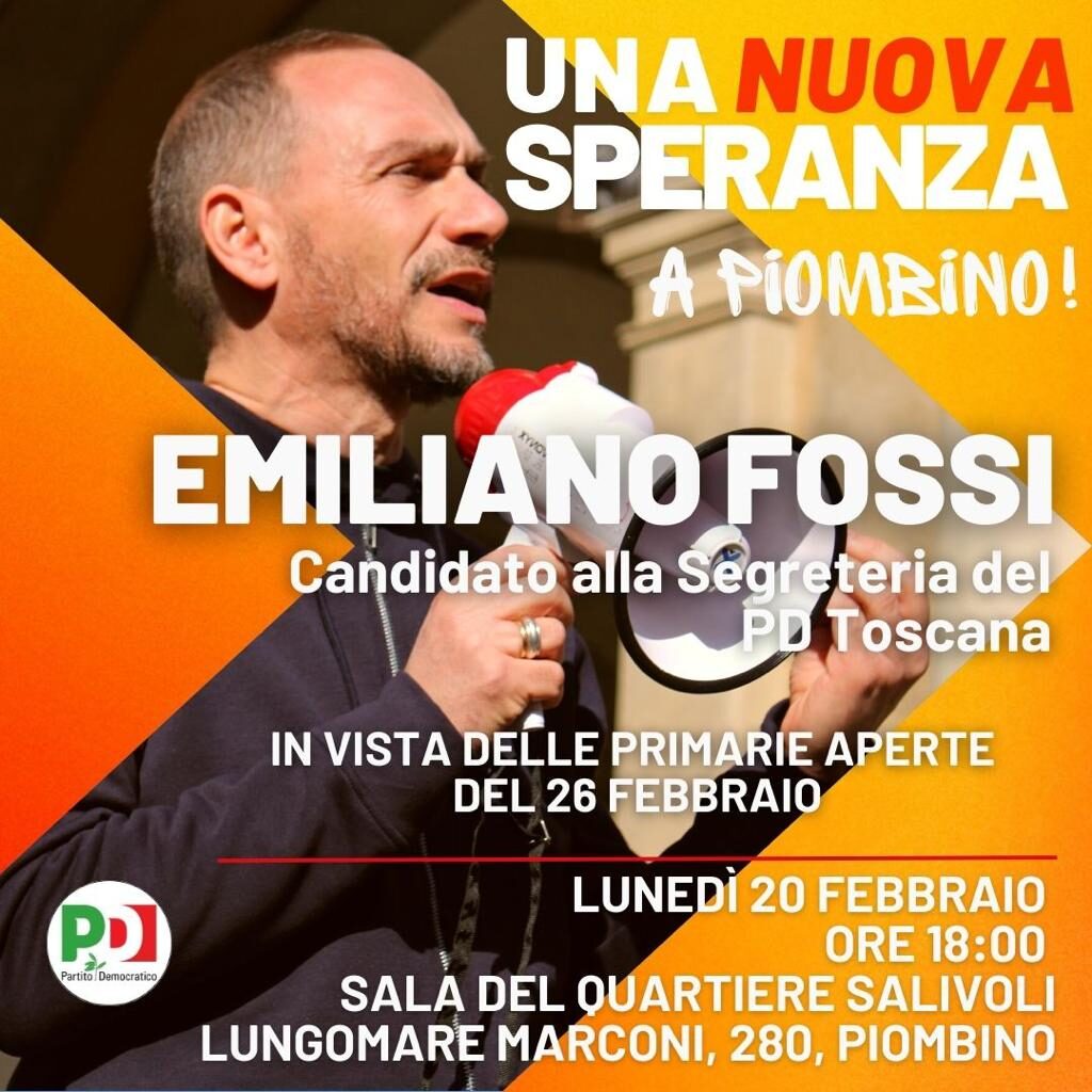 Lunedì 20 febbraio 2023 alle ore 18.00 presso la sala del  Quartiere Salivoli in Lungomare Marconi 280 si terrà un incontro con Emiliano Fossi, candidato alla segreteria del Partito Democratico della Toscana.