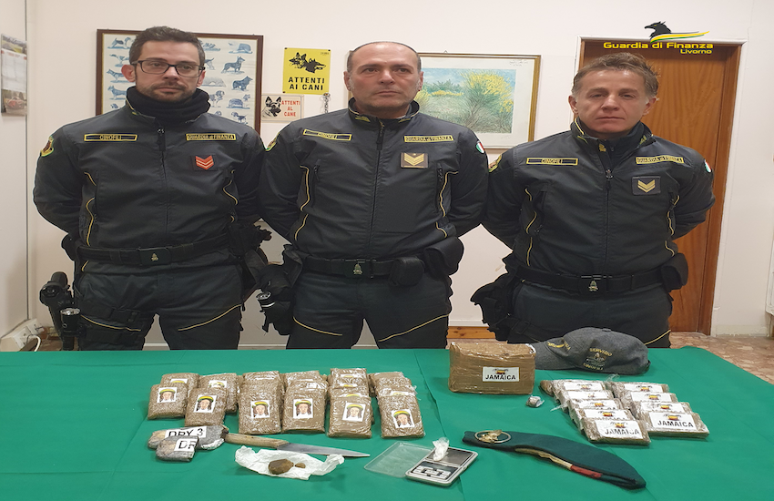Fondamentale poi l’attività svolta, giorno e notte, sulle strade da parte dei baschi verdi e delle unità cinofile del Gruppo di Livorno. Nel corso di un servizio di pattugliamento, in una zona periferica della città oggetto di alcune segnalazioni, i militari hanno individuato un’autovettura che compiva una manovra anomala; fermata in sicurezza a bordo strada, i passeggeri hanno evidenziato preoccupazione ed agitazione. A conferma che qualcosa non andasse, si è quindi aggiunto l’ingresso in campo di tre “stelle” della squadra cinofili labronica, ossia i cani antidroga Brook, Gera e Jambo (due pastori tedeschi ed un labrador), condotti dai rispettivi militari specializzati, che hanno fornito chiare segnalazioni.