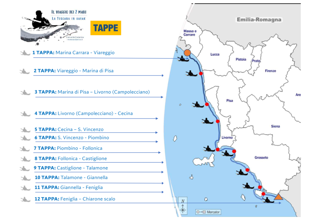 Gli scopi del viaggio sono molteplici: esplorare, conoscere e documentare la costa toscana, ricca di biodiversità ambientali e bellezze storico-culturali, con un mezzo eco-sostenibile come il kayak, in un’ottica di One Health (così come indicato dall’OMS); promuovere la tutela degli ambienti e delle risorse marino-costiere; valorizzare la conoscenza e la cultura del mare, sia in termini di sicurezza che di corretto rapporto con le Istituzioni deputate alla sua tutela.