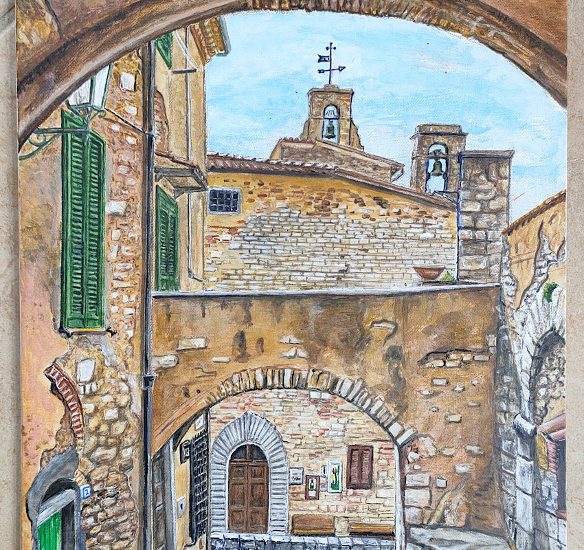 E prosegue: “Poiché quanto ho potuto apprendere da Cesare ha riguardato essenzialmente gli aspetti tecnici della pittura, i miei dipinti fanno per lo più riferimento ad opere di veri artisti, sono molto attratto ad esempio dal Rinascimento Senese, che cerco di reinterpretare con qualche ‘licenza poetica’. Pur essendo emigrato da Campiglia nel 1960, sono sempre rimasto legato al mio paese natale, cosicché mi è venuto naturale dipingerne alcuni scorci che mi riportano alla mente i tempi felici e gli amici della mia adolescenza”.
