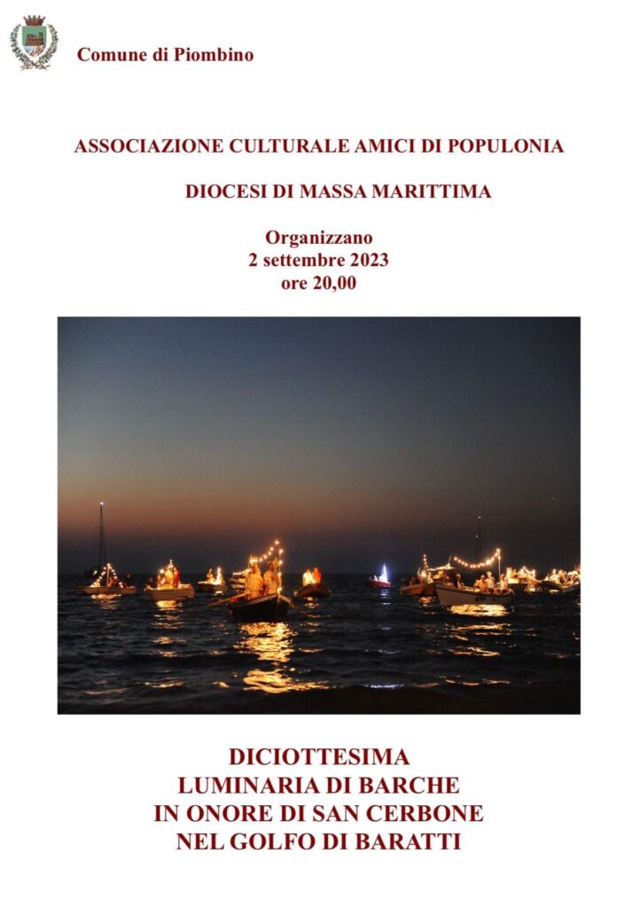La Luminaria di San Cerbone è un evento tradizionale che, dopo lo stop causato dalla pandemia, torna ad animare il Golfo di Baratti grazie all’impegno dell’associazione organizzatrice Amici di Populonia con il patrocinio del Comune di Piombino e della Diocesi e la collaborazione dei circoli nautici che operano nel golfo.