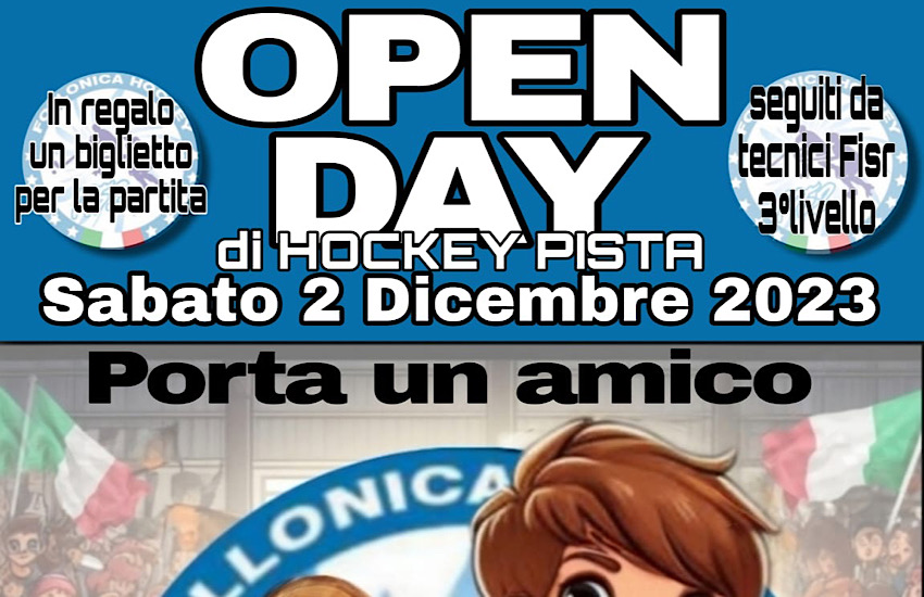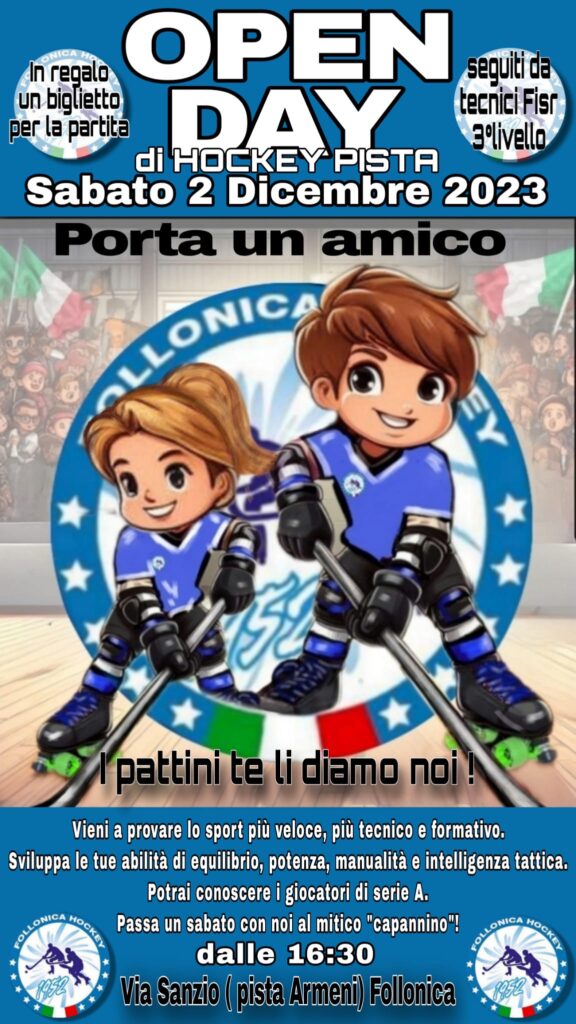 Sabato 2 dicembre 2023 alle 16.30 al Capannino ci sarà un Open Day di Hockey su Pista. Sono invitati a partecipare tutti i bambini che vogliono provare questo fantastico sport con istruttori di terzo livello FIRS. Che portino un amico con loro. In tale occasione potranno conoscere i giocatori di serie A1 per autografi ecc.