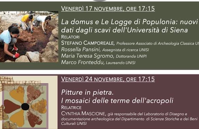 Primo appuntamento venerdì 17 novembre alle ore 17:15 con “La domus e Le Logge di Populonia: nuovi dati dagli scavi dell’Università di Siena”. Relatori saranno Stefano Camporeale Professore Associato di Archeologia Classica UNISI, Rossella Pansini Assegnista di ricerca UNISI, Maria Teresa SgromoDottoranda UNIPI, Marco Fronteddu Laureando UNISI.