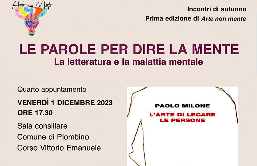 Quarto e ultimo appuntamento della rassegna culturale Arte non mente, il ciclo di incontri culturali ideato e curato da Marina Riccucci, docente di Letteratura italiana dell’Università di Pisa, e realizzato in collaborazione con l’Assessorato alla Cultura del Comune di Piombino e con il patrocinio del Dipartimento di Filologia, Letteratura e Linguistica di Unipi. Questa volta il tema è delicatissimo e quanto mai complesso: la malattia mentale, i suoi meandri, le sue indicibilità, i suoi abissi. Paolo Milone, psichiatra e scrittore, autore del romanzo L’arte di legare le persone (Einaudi) parlerà con Marina Riccucci del rapporto tra medicina e letteratura, della difficoltà di dire la mente che soffre, delle parole che ci sono e di quelle che ancora attendono di essere trovate. L’incontro, che si terrà Venerdì 1 dicembre, alle ore 17.30, presso la Sala Consiliare del Comune di Piombino, sarà ‘illustrato’ dalla proiezione (curata da Giacomo Doni, curatore del sito Mente in rete) di segmenti inediti di lettere di pazienti dell’ex manicomio di Maggiano, dove lo psichiatra-scrittore Mario Tobino visse e lavorò per quasi quarant’anni. “Chiuderemo questa prima rassegna, dandoci appuntamento all’anno prossimo,” – commenta la Prof.ssa Riccucci – “entrando dentro l’universo dolente della malattia mentale attraverso i verbi, i sostantivi e le metafore della lingua della letteratura: sarà una sorta di viaggio per capire, per conoscere, per scegliere di non ignorare”.