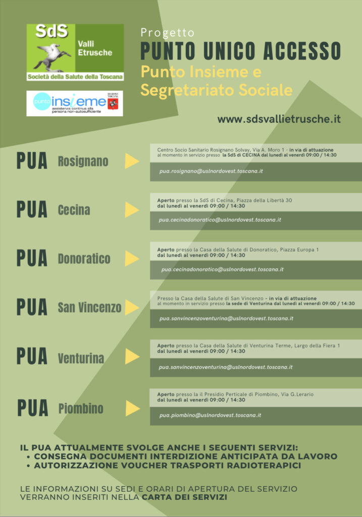 Saranno sei gli sportelli che costituiranno la nuova rete di accesso ai servizi socio sanitari e che andranno a coprire in maniera uniforme il territorio delle Valli Etrusche. Il servizio, chiamato in base alle nuove disposizioni legislative (Dm 77/2022) Punto Unico di Accesso (Pua), avrà sede a Rosignano, Cecina, Donoratico, San Vincenzo, Venturina e Piombino, e ricoprirà le mansioni precedentemente svolte all’interno degli sportelli di Segretariato sociale e dei Punti Insieme.