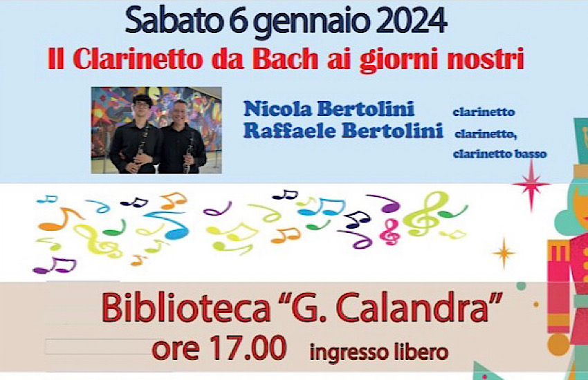 Secondo appuntamento sabato prossimo, 6 gennaio, con i concerti di Etruria Classica nell’ambito del programma del Verde Dicembre. Nella sala della biblioteca G. Calandra alle ore 17 si esibirà il duo formato da Nicola e Raffaele Bertolini, con un programma dal titolo ‘Il clarinetto da Bach ai giorni nostri’.