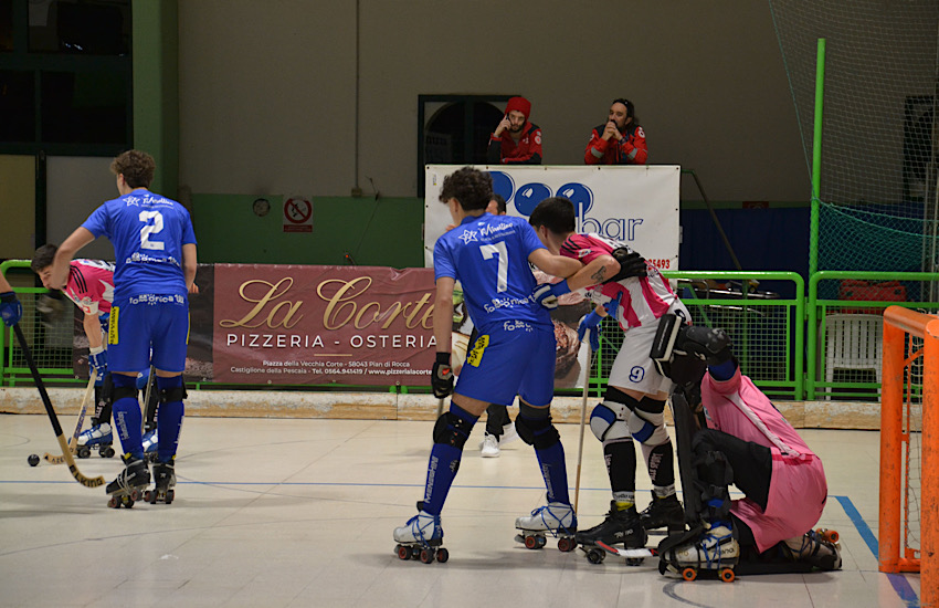 La Blue Factor ci mette cuore e impegno, ma alla fine i tre punti sono dell’Iren Follonica: al Casa Mora il derby di A2 lo vince per 5-4 la squadra di Franco Polverini, con i biancocelesti di Massimo Bracali costretti ancora ad alzare bandiera bianca. La partita è stata comunque bella e combattuta fino alla fine. Dopo 10’ la sblocca Brunelli che riprende una respinta corta del portiere su tiro di Piro.  Cabiddu approfitta di un disimpegno errato del Castiglione, s’invola verso la porta e insacca l’1-1. Il Castiglione sbanda e Adriano Maggi in contropiede da destra mette dentro il 2-1. Poi Montauti fa fallo su Polverini: Bracali spara fuori il rigore. Il Follonica però allunga: Bracali è fermato da Saitta ma in tap-in Mattia Polverini mette dentro. Cabiddu commette fallo da blu su Guarguaglini, ed è lo stesso attaccante del Castiglione che riesce a segnare dopo una prima respinta, sulla punizione di prima. Ad inizio ripresa Guarguaglini serve in contropiede Brunelli che infila l’angolo basso per il 3-3. Cabiddu aggancia Brunelli e si becca un nuovo blu. Brunelli però non trasforma la punizione con maggi che para. Anche Montauti aggancia Polverini: Saitta respinge le conclusioni di Cabiddu. Il 4-3 lo segna Cabiddu, assist di Bracali e tiro al volo all’incrocio. Poco dopo ancora Bracali su una punizione due al limite dell’area indovina l’angolo giusto per il 5-3. Sul decimo fallo del Castiglione, Saitta stoppa la punizione di Polverini. Brunelli aggancia Bracali e si prende il blu a due minuti dalla fine: Cabiddu su punizione centra il palo. In inferiorità numerica il Castiglione accorcia con Guarguaglini, 5-4, ma non c’è più tempo.