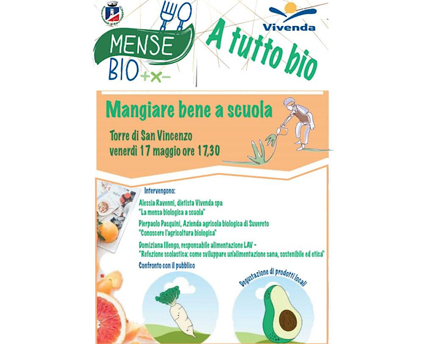 Si terrà domani, venerdì 17 maggio, alle ore 17.30 alla sala della Torre l’incontro ‘Mangiare bene a scuola’, una prima iniziativa pubblica di promozione dell’alimentazione biologica con la partecipazione di Vivenda, di un produttore agricolo del territorio e di una rappresentante della Lav.