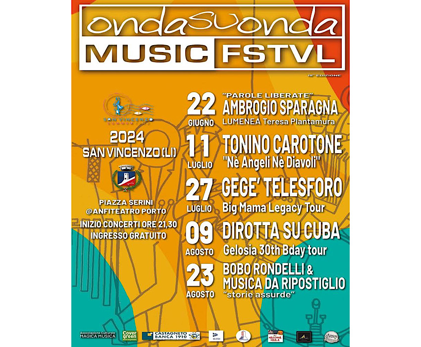 Gli appuntamenti di OndasuOnda Music Festival proseguiranno l’11 luglio con Tonino Carotone, che farà tappa col suo tour ‘Né angeli né diavoli’. A seguire il 27 luglio Gegè Telesforo, per una tappa del Big Mama Legacy Tour, il 9 agosto Dirotta su Cuba, Gelosia 30th Bday tour. Ultimo appuntamento il 23 agosto con Bobo Rondelli & Musica da Ripostiglio, ‘Storie assurde’. OndasuOnda Music Festival rappresenta da anni ormai un appuntamento fisso e imperdibile dell’estate sanvincenzina. Un evento organizzato dal Comune di San Vincenzo in collaborazione con l’associazione Magica Musica.