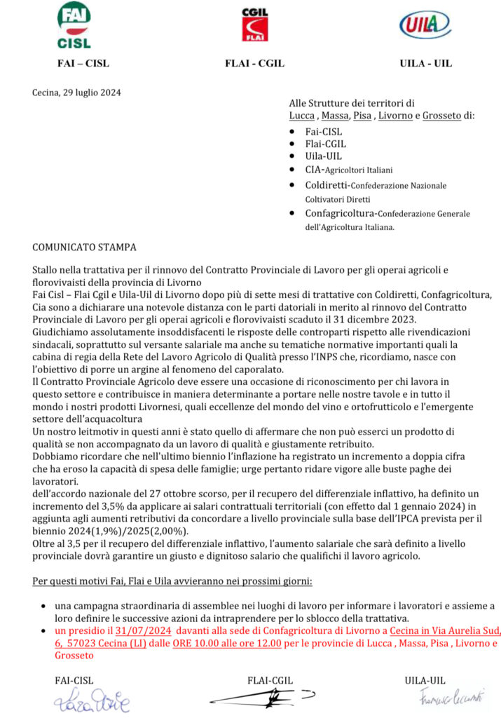 Mobilitazione per il contratto provinciale di lavoro in agricoltura