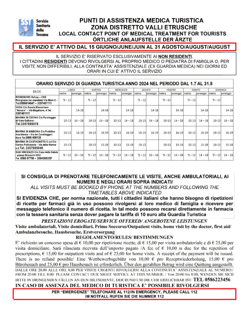 “ A giugno, avevo lanciato l’allarme – continua Parodi – perché una città come la nostra che si vuol definire turistica, per l’ennesima volta non aveva il presidio di Guardia medica estiva. In quel caso la comunicazione era relativa al solo mese di giugno e auspicavo che l’Amministrazione si attivasse per i mesi successivi, invece purtroppo leggendo il calendario definitivo possiamo solo constatare che anche a luglio agosto e settembre a Piombino (città da 1 milione di turisti come sventola il nostro sindaco) manca un servizio di base per la sicurezza e la salute dei turisti.”