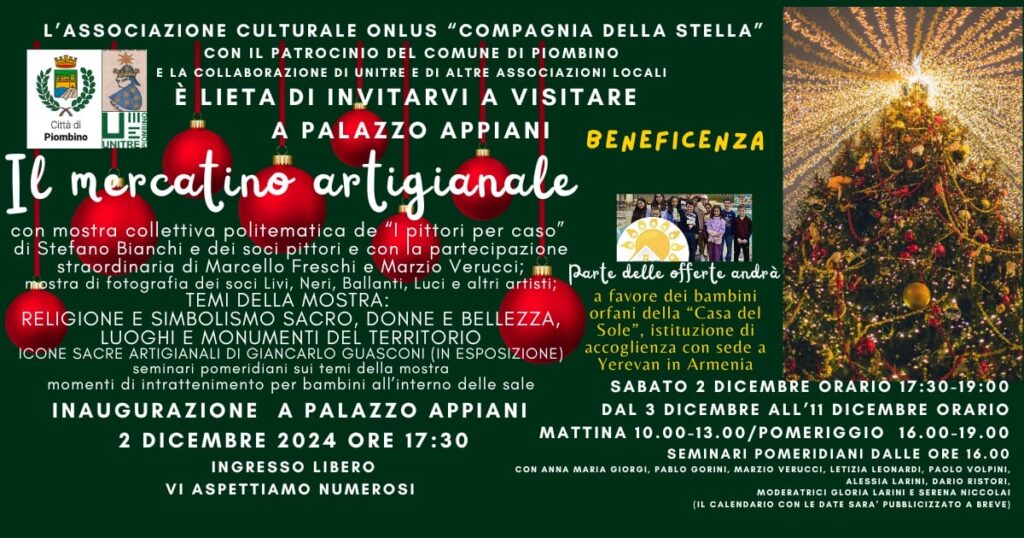 Il 3 dicembre, alle 16.00 si terrà la conferenza della scrittrice e giornalista Letizia Leonardi: “La situazione in Armenia e il problema dei profughi e degli orfani”.Mercoledì 4 dicembre alle 16.00 Dario Ristori parlerà de “La Baciocca a Piombino”. Giovedì 5 alle 17.30sarà la volta della conferenza di Paolo Volpini dell’Associaione Astrofili di Piombino “Comete di Natale e non solo osservate dagli Astrofili di Piombino”. Il 6 dicembre alle 16.00 Giancarlo Guasconi e Anna Maria Giorgi parleranno di “Arte sacra: come si scrive un’icona”. Sabato 7 dicembre, sempre alle 16.00 Anna Maria Giorgi terrà la conferenza “Alle origini del racconto dei Magi fra storia e Vangeli”. Il 9 dicembre alle 16.00 il professore Pablo Gorini, presidente dell’Unitre di Piombino parlerà di “Simonetta Vespucci, la Venere di Piombino”. Il 10 dicembre alle 16.00 sarà la volta di Alessia Larini che ci parlerà di “Cosa raccontano le ossa? I casi di Baratti e della Valle D’Albaida”. A conclusione dell’iniziativa, l’11 dicembre alle 16.00 Marzio Verucci terrà la conferenza “Bioarchitettura e vivere consapevole” e, a seguire, sarà estratto il numero vincitore della lotteria.