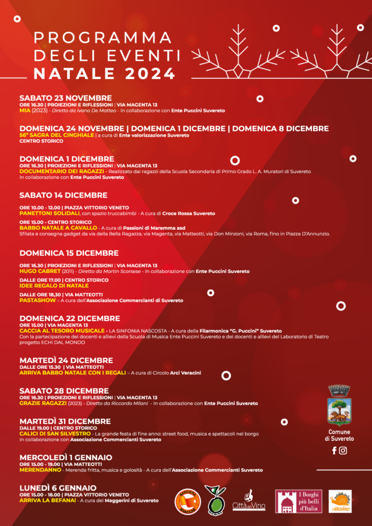 Sabato 14 Dicembre mattina ci sarà il banco dei panettoni solidali con uno spazio truccabimbi a cura della Croce rossa di Suvereto, mentre nel pomeriggio arriveranno i Babbi Natale a cavallo con Passioni di Maremma, che sfileranno per il paese consegnando gadget ai bambini.