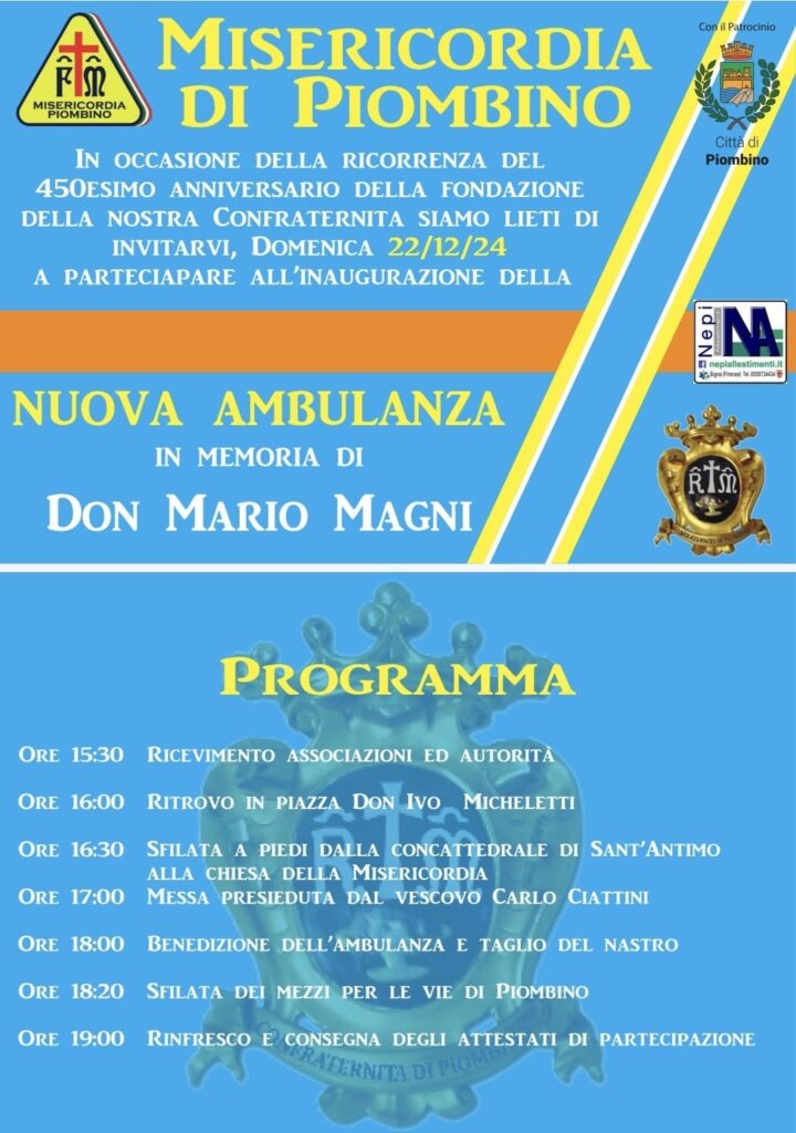 La Misericordia di Piombino celebra i 450 anni dalla sua fondazione avvenuta nel 1574. Il 22 dicembre a partire dalle ore 15.30 inizieranno le celebrazioni. Alle ore 17.00 la Santa Messa celebrata da Mons. Carlo Ciattini, successivamente l’inaugurazione di una nuova ambulanza in memoria di Don Mario Magni, per molti anni Correttore della Fraternita. Dopo il tradizionale corteo cittadino con il mezzo inaugurato, vi sarà un momento di intrattenimento per gli ospiti presso il campo di Rugby dei Diaccioni. E’ stata confermata la partecipazione di autorità civili e militari, volontari delle associazioni locali e di altre città, e tanti amici della Misericordia di Piombino. Chiunque voglia partecipare è sempre il benvenuto.