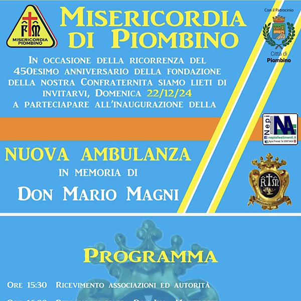 La Misericordia di Piombino celebra i 450 anni dalla sua fondazione avvenuta nel 1574. Il 22 dicembre a partire dalle ore 15.30 inizieranno le celebrazioni. Alle ore 17.00 la Santa Messa celebrata da Mons. Carlo Ciattini, successivamente l’inaugurazione di una nuova ambulanza in memoria di Don Mario Magni, per molti anni Correttore della Fraternita. Dopo il tradizionale corteo cittadino con il mezzo inaugurato, vi sarà un momento di intrattenimento per gli ospiti presso il campo di Rugby dei Diaccioni. E’ stata confermata la partecipazione di autorità civili e militari, volontari delle associazioni locali e di altre città, e tanti amici della Misericordia di Piombino. Chiunque voglia partecipare è sempre il benvenuto.