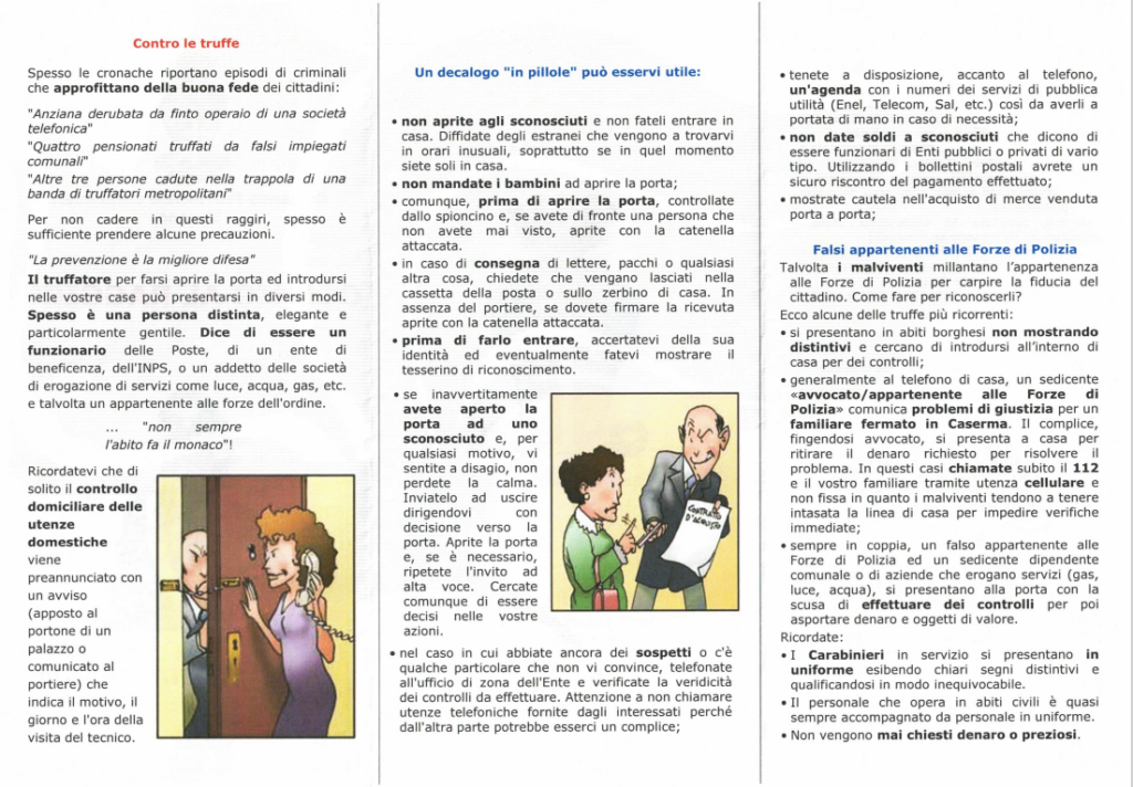 In tale ottica pertanto, prestare sempre massima attenzione, ma soprattutto a rivolgersi con fiducia ai Carabinieri in caso di sospetti, chiamando il 112 N.U.E. per effettuare un’immediata segnalazione, nonché consultare il sito Carabinieri.it in cui sono illustrate le principali tipologie di truffe e come riconoscerle, poiché le tecniche adottate dai truffatori, per quanto subdole e fantasiose, hanno schemi ricorrenti ed individuarli è il primo passo per difendersi.