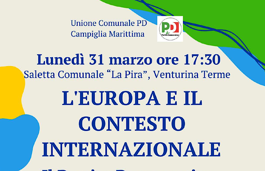 Lunedì 31 marzo alle ore 17:30 alla Saletta Comunale “G. La Pira” di Venturina Terme, il Partito Democratico di Campiglia Marittima organizza l’incontro “L’Europa e il contesto internazionale”, con l’On. Arturo Scotto della Direzione Nazionale del PD e la sindaca di Campiglia Marittima Alberta Ticciati. L’incontro sarà coordinato dal giornalista Manolo Morandini e si concentrerà sulle sfide del partito di fronte in termini di politica estera, in un momento storico in cui è necessario fare i conti con la natura dell’Europa e il suo ruolo nel nuovo ordine mondiale.