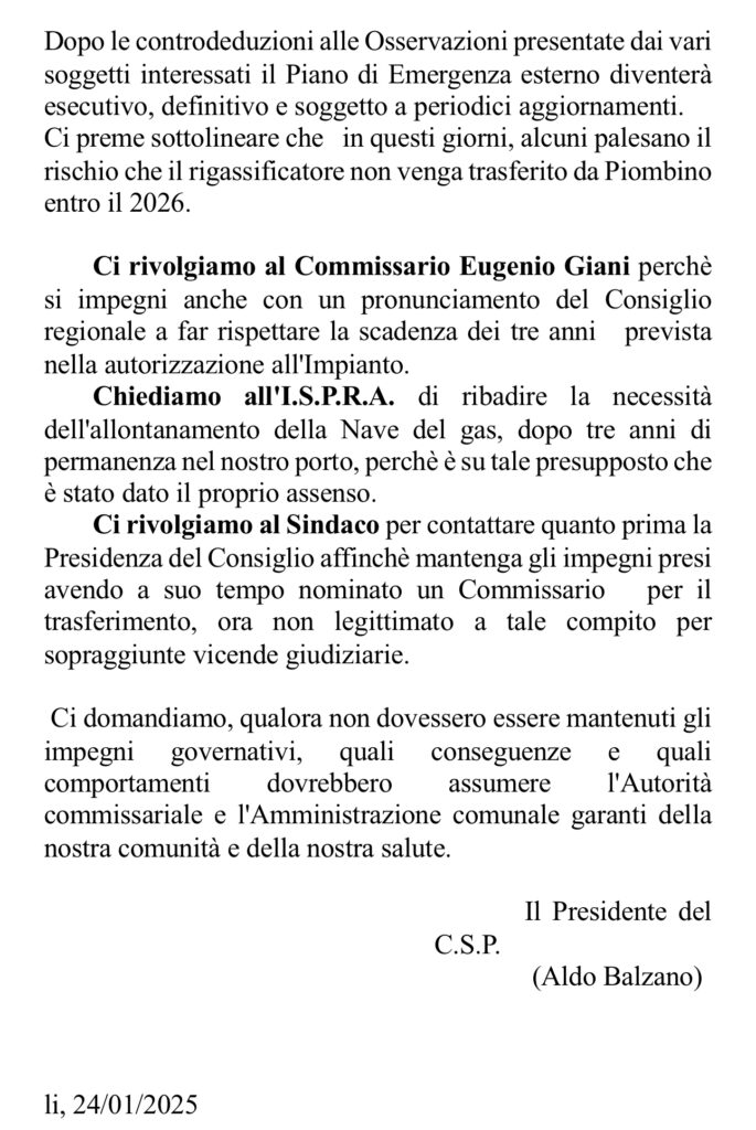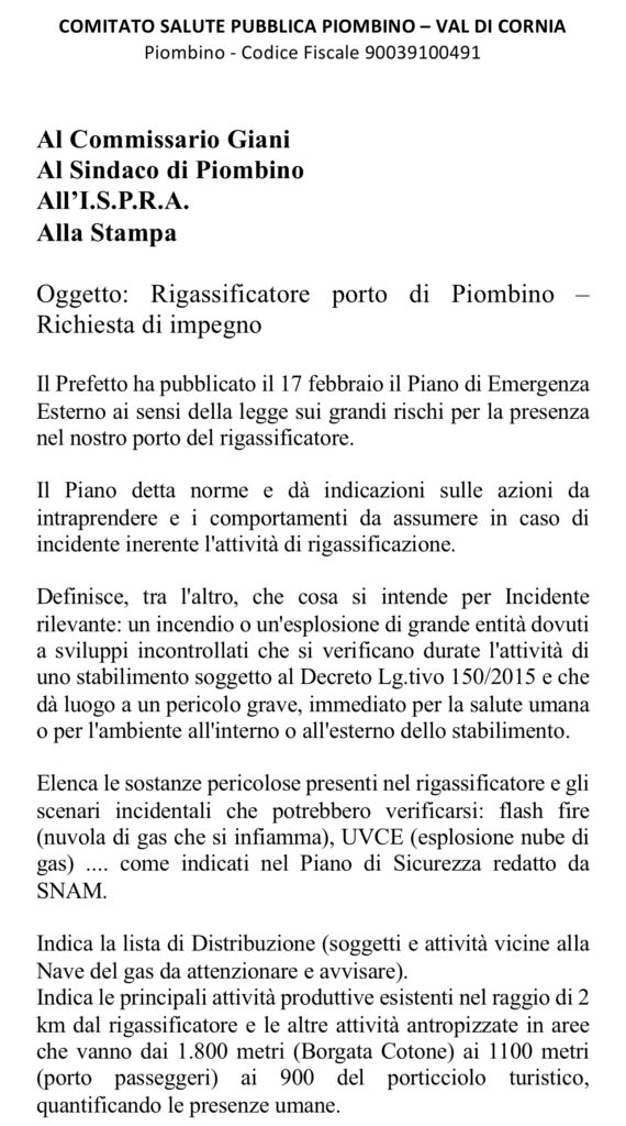 Richiesta di impegno Rigassificatore Piombino