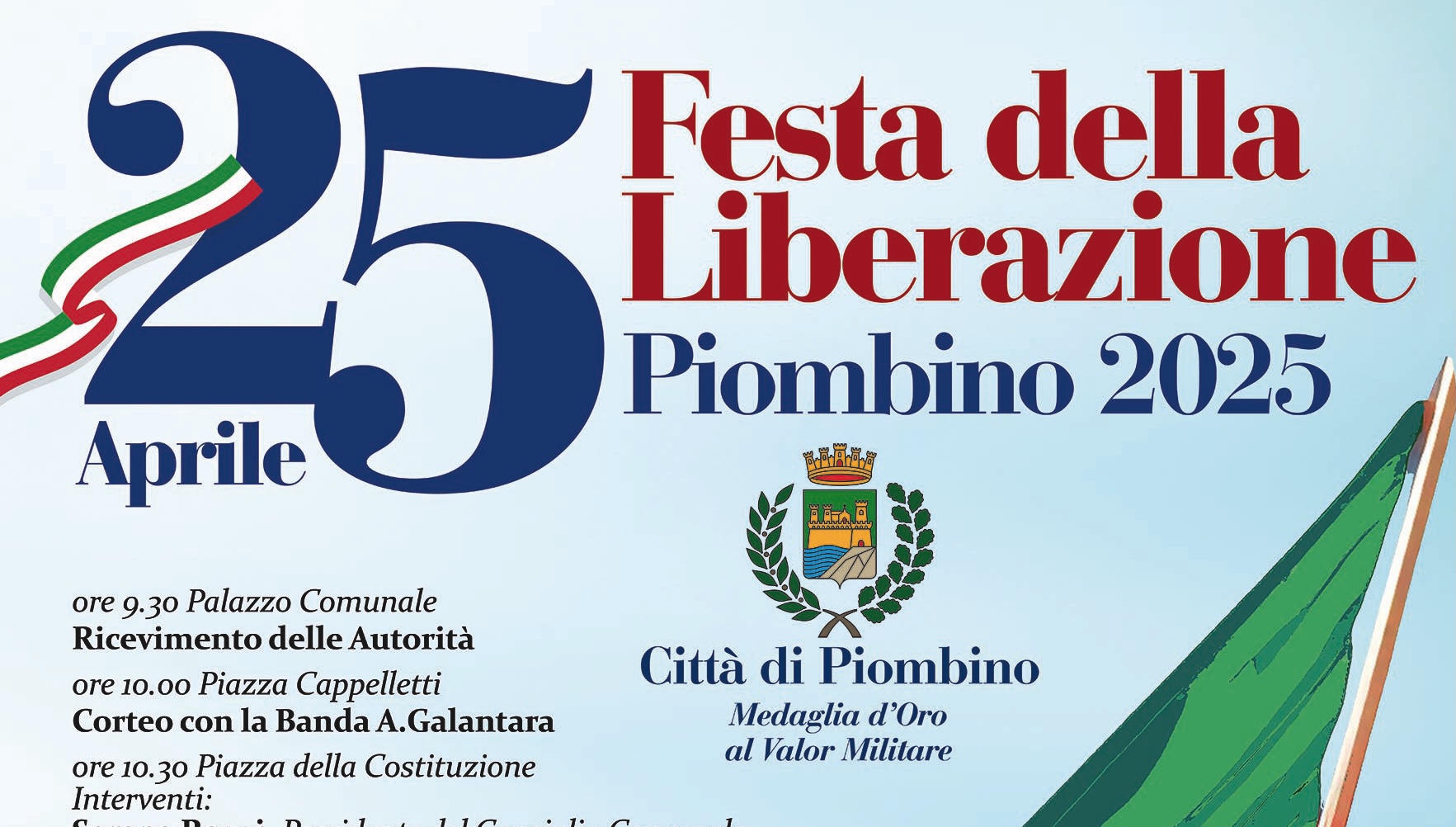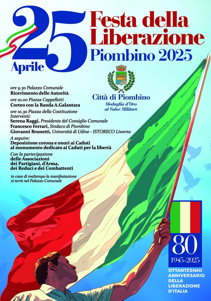 Alle 10.30 nell’area anfiteatro della piazza sarà la volta degli interventi: prenderanno la parola il presidente del Consiglio comunale Serena Raggi, il sindaco di Piombino Francesco Ferrari e Giovanni Brunetti, docente a contratto all’Università di Udine e ricercatore presso l’Istituto Storico della Resistenza e dell’Età Contemporanea di Livorno. La deposizione della corona e gli onori ai caduti al Monumento dedicato ai Caduti per la Libertà concluderanno la cerimonia.