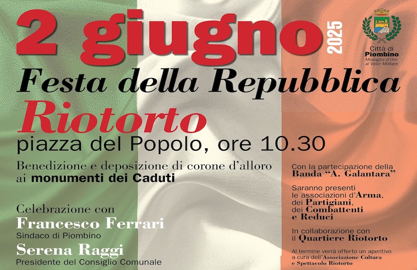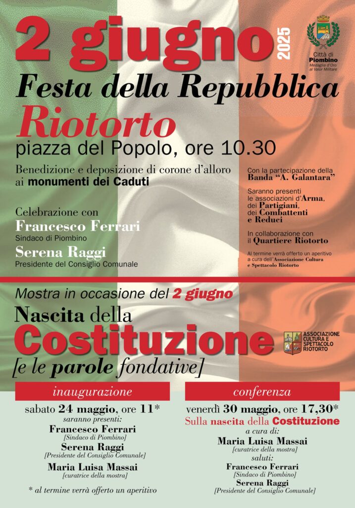 In occasione della Festa della Repubblica del 2 giugno, il Comune di Piombino organizza in collaborazione con il Quartiere Riotorto una serie di eventi per celebrare i valori fondanti della nostra Repubblica.