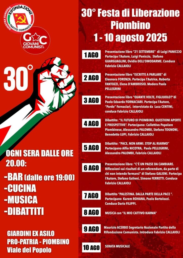 Il 1 agosto 2025, prende il via la Festa di Liberazione del Partito della Rifondazione Comunista di Piombino. La Festa, come lo scorso anno, si svolgerà all’interno dell’area dei Giardini ex Asilo Pro Patria, in Viale del Popolo a Piombino.