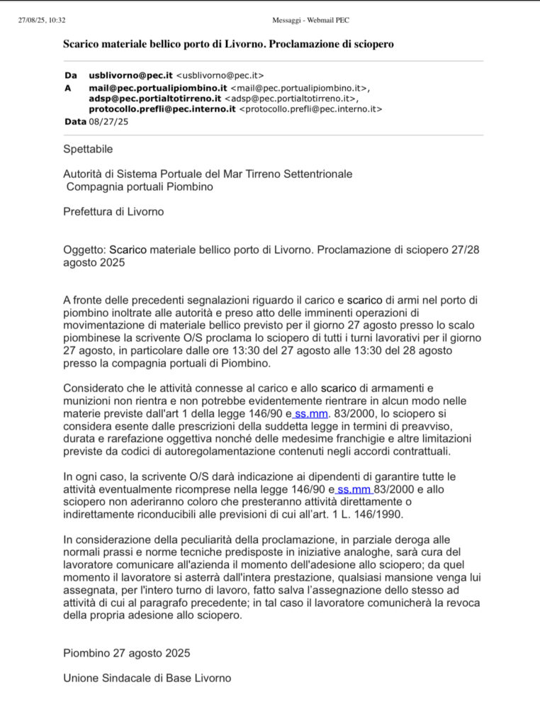 L’Unione Sindacale di Base, oltre che a partecipare alla manifestazione ha deciso di proclamare uno sciopero di 24 ore all’interno della Compagnia Portuali di Piombino nella stessa giornata, dare modo a quei lavoratori che volessero rifiutarsi di essere complici dei traffici di morte di essere coperti e non rischiare alcuna conseguenza.