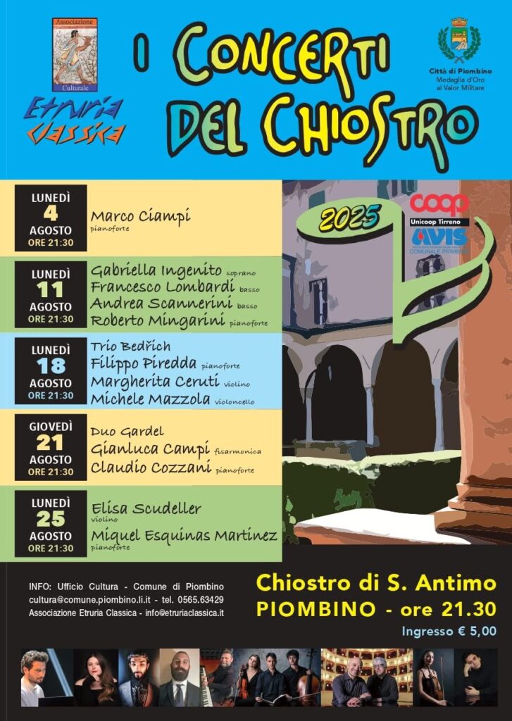Anche quest’anno, con l’arrivo dell’estate, torna uno degli appuntamenti musicali più attesi della stagione: la rassegna concertistica “I Concerti del Chiostro”, giunta alla sua 29esima edizione, in programma nel mese di agosto nel suggestivo Chiostro di Sant’Antimo a Piombino.