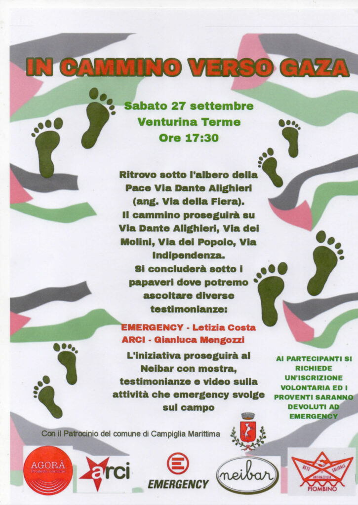 L’iniziativa denominata “In cammino verso Gaza” si terrà Sabato 27 Settembre 2025 alle ore 17:30 a Venturina Terme con ritrovo sotto l’albero della Pace in Via Dante Alighieri angolo Via della Fiera, la camminata lungo le strade del paese arriverà nella zona pedonale sotto i papaveri dove saranno ascoltate le testimonianze di Letizia Costa di Emergency e di Gianluca Mengozzi di Arci e saranno fatte delle letture di poesie di scrittori Palestinesi.
