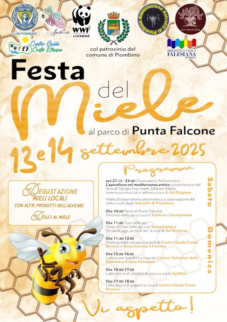 Sabato 13 e domenica 14 settembre 2025, al Parco di Punta Falcone, in programma la Festa del Miele, un evento organizzato dal Centro Guide Costa Etrusca insieme a moltre altre associazioni del territorio con il patrocinio del Comune di Piombino, un’iniziativa con l’obiettivo di valorizzare il patrimonio naturalistico e storico del territorio facendo conoscere più da vicino il mondo delle api e del miele, con tante attività diverse per adulti e bambini.