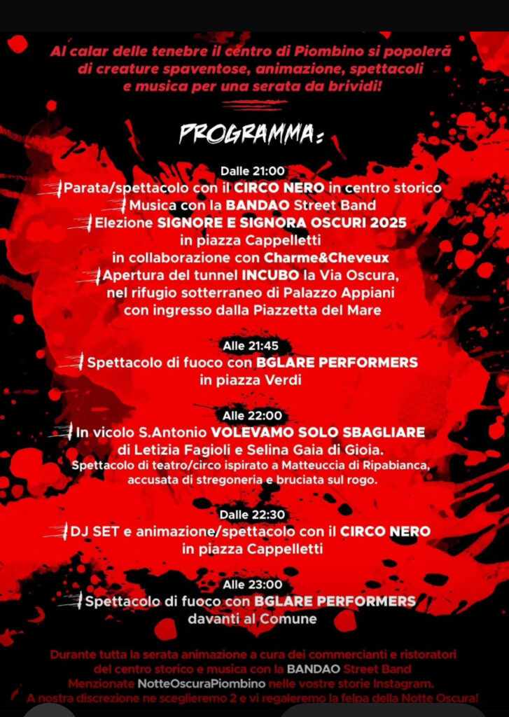 Il programma della Notte Oscura, organizzata dalla ProLoco, prenderà il via alle 21 con la parata-spettacolo del Circo Nero che animerà il centro storico, accompagnata dalla musica della Bandao Street Band. In piazza Cappelletti si terrà l’elezione di Signore e Signora Oscuri 2025, in collaborazione con Charme & Cheveux, mentre nei sotterranei di Palazzo Appiani sarà possibile visitare il tunnel Incubo – La Via Oscura. Alle 21.45 è previsto lo spettacolo di fuoco dei Bglare Performers in piazza Verdi. Alle 22, in vicolo Sant’Antonio, andrà in scena Volevamo solo sbagliare, lo spettacolo di teatro e circo di Letizia Fagioli e Selina Gaia di Gioia. Dalle 22.30 la serata proseguirà in piazza Cappelletti con il DJ set e l’animazione del Circo Nero e alle 23 un nuovo spettacolo di fuoco dei Bglare Performers davanti al Comune.